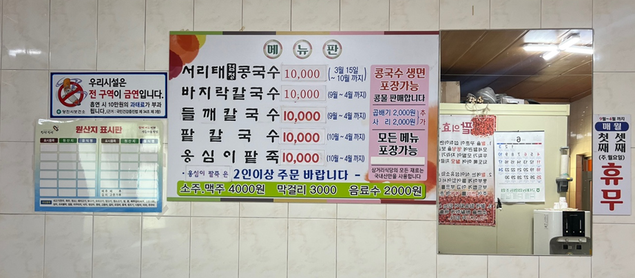 (겨울엔 바지락칼국수, 들깨칼국수, 팥칼국수, 옹심이팥죽을 하고 여름에만 먹을 수 있는 단일메뉴 서리태콩국수)