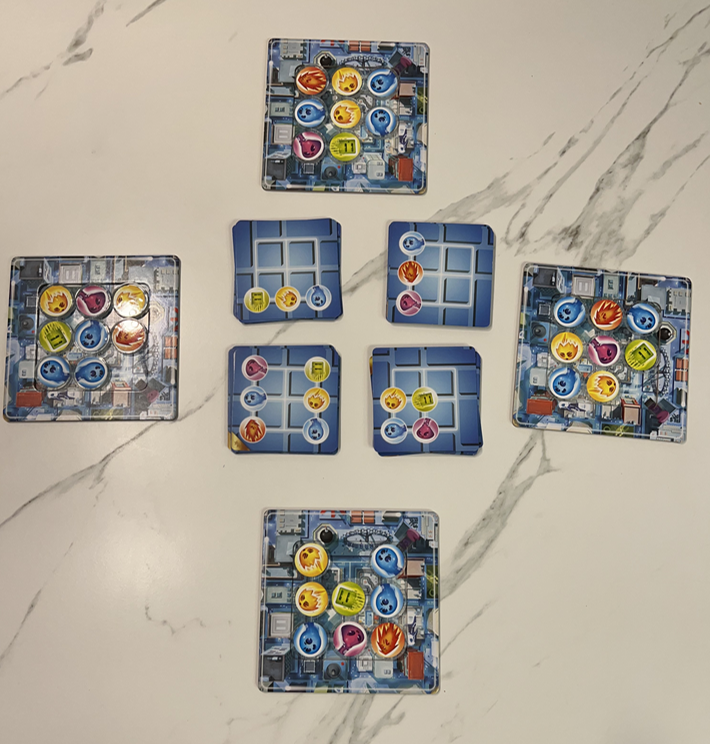 에너지 보드 4장(14cm×14cm), 일렉트론 토큰 4세트(파랑3,노랑2,빨강1,보라1,연두1)
